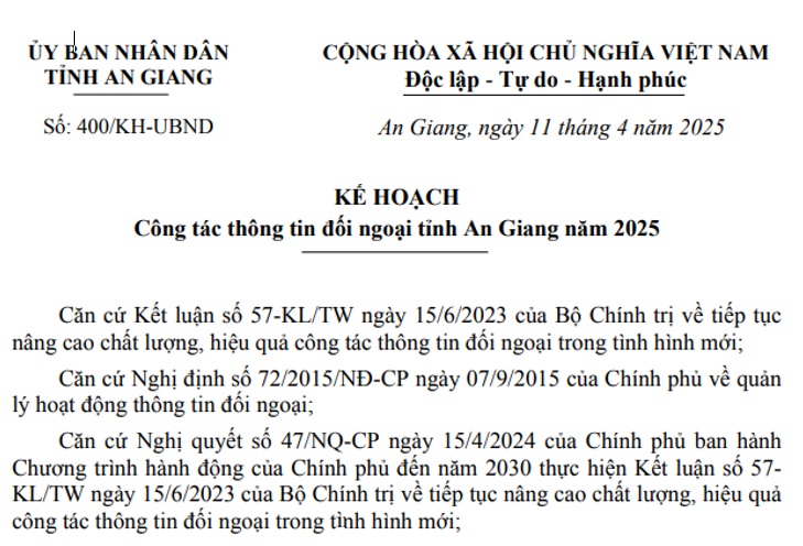 Ngày 11/4/2024, Ủy ban nhân dân tỉnh An Giang đã ban hành Kế hoạch số 400/KH-UBND về công tác thông tin đối ngoại (TTĐN) tỉnh An Giang năm 2025, nhằm nâng cao hiệu quả tuyên truyền, quảng bá hình ảnh đất nước, con người Việt Nam nói chung và An Giang nói riêng ra thế giới.