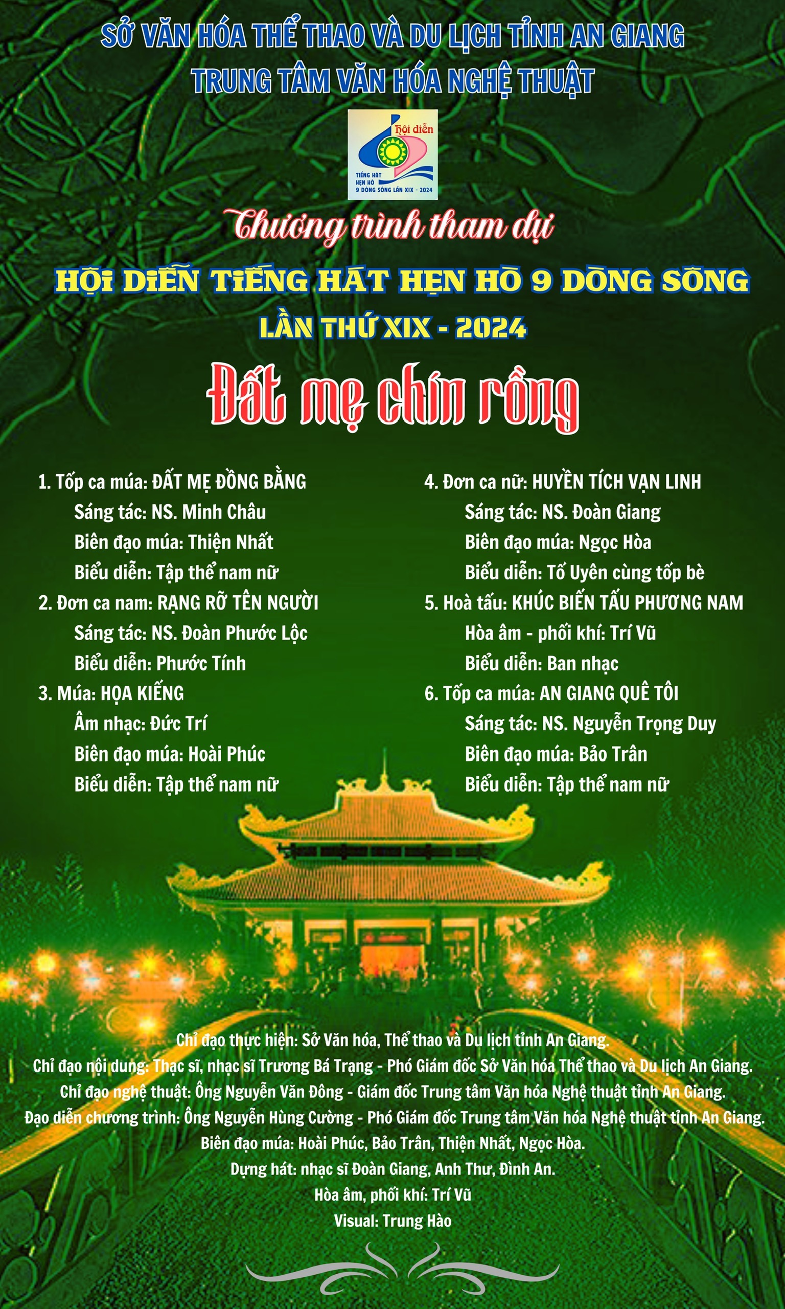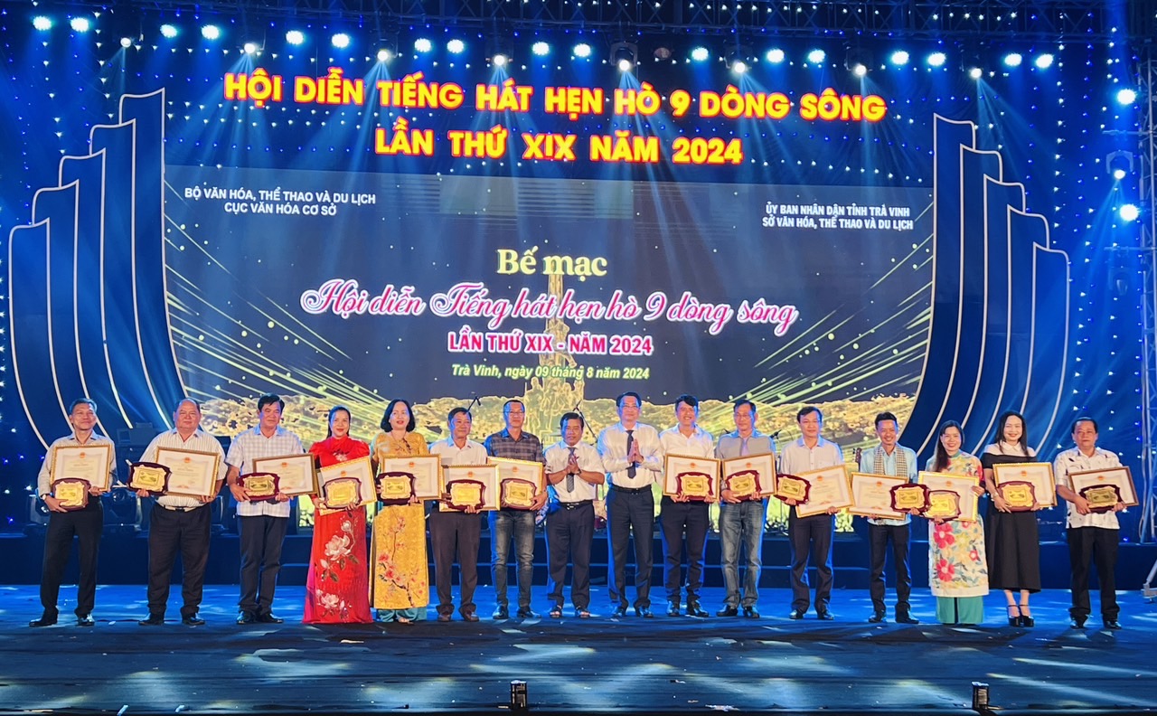 Tối ngày 09/8/2024, tại TP. Trà Vinh (tỉnh Trà Vinh), Cục Văn hóa Cơ sở phối hợp với Sở Văn hóa Thể thao và Du lịch tỉnh Trà Vinh tổ chức lễ Bế mạc Hội diễn “Tiếng hát hẹn hò 9 dòng sông” lần thứ XIX năm 2024. Đơn vị An Giang xuất sắc đoạt 3 huy chương vàng, 2 huy chương bạc và Bằng khen của UBND tỉnh Trà Vinh.