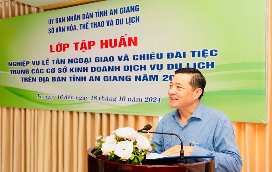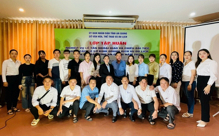 Sáng ngày 16 tháng 10 năm 2024, Sở Văn hóa, Thể thao và Du lịch phối hợp với Trường Cao đẳng Du lịch Cần Thơ tổ chức khai giảng lớp tập huấn nghiệp vụ lễ tân ngoại giao và chiêu đãi tiệc trong các cơ sở kinh doanh dịch vụ du lịch trên địa bàn tỉnh An Giang năm 2024. Lớp tập huấn nghiệp vụ lễ tân ngoại giao và chiêu đãi tiệc diễn ra trong 03 ngày từ ngày 16/9/2024 đến hết ngày 18/9/2024.