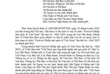 Thông báo về việc lựa chọn tổ chức đấu giá tài sản Thông báo 25/04/2025 - aA + Tài liệu đính kèm: thông báo công khai việc lựa chọn tổ chức đấu giá tài sản (445.81 KB) Tin tức liên quan THÔNG BÁO KẾT QUẢ LỰA CHỌN TỔ CHỨC HÀNH NGHỀ ĐẤU GIÁ TÀI SẢN Thông tin báo chí – Công bố công khai Thông báo 16/05/2025 THÔNG BÁO MỜI THAM GIA TRIỂN LÃM ẢNH “VIỆT NAM QUA ỐNG KÍNH NHIẾP ẢNH GIA QUỐC TẾ” (lần 3) Thông tin tuyên truyền Thông tin báo chí – Công bố công khai Thông báo 22/04/2025 Quy hoạch mạng lưới cơ sở văn hóa và thể thao, Quy hoạch hệ thống du lịch thời kỳ 2021-2030, tầm nhìn đến năm 2045 Thông báo 24/10/2024 Cuộc thi trực tuyến toàn quốc tìm hiểu nội dung cuốn sách “Xây dựng và phát triển nền văn hóa Việt Nam tiên tiến, đậm đà bản sắc dân tộc” của cố Tổng Bí thư Nguyễn Phú Trọng Thông báo 16/10/2024 Trường Chính trị Tôn Đức Thắng Thông báo tuyển sinh đào tạo, bồi dưỡng công chức, viên chức 2024 Thông báo 15/01/2024 Ra mắt câu lạc bộ đờn ca tài tử và trích đoạn cải lương Thông báo 29/03/2021