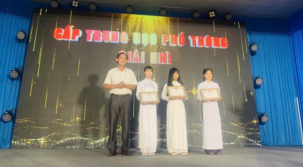 Thí sinh Nguyễn Thị Anh Thư: lớp 10A5; thí sinh Chung Thị Mỹ Hằng: lớp 10A6 Trường THPT Nguyễn Quang Diêu – Thị xã Tân Châu và thí sinh Phạm Gia Như: lớp 10A10, trường THPT Chu Văn An – huyện Phú Tân đã xuất sắc đạt giải Nhì cấp THPT;