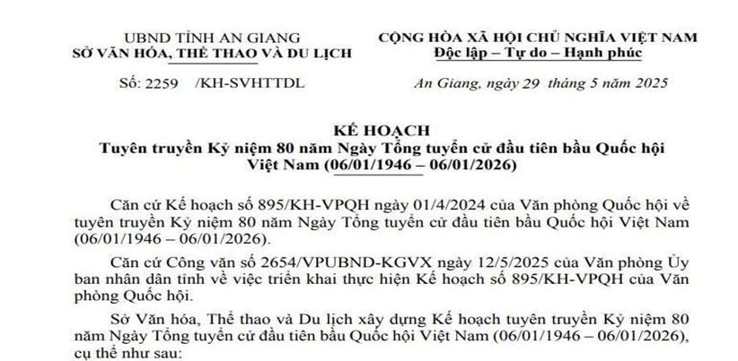 Ngày 29/5/2025, Sở Văn hóa, Thể thao và Du lịch tỉnh An Giang ban hành Kế hoạch tuyên truyền Kỷ niệm 80 năm Ngày Tổng tuyển cử đầu tiên bầu Quốc hội Việt Nam (06/01/1946 – 06/01/2026).